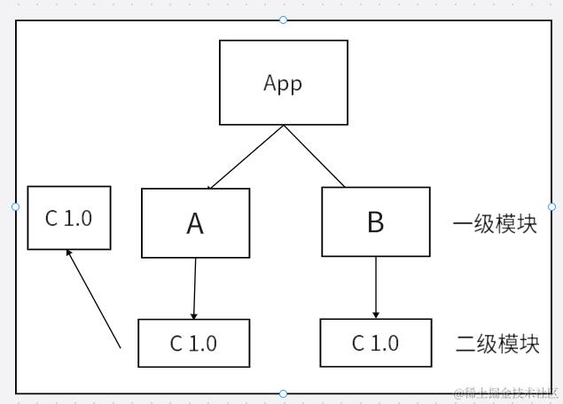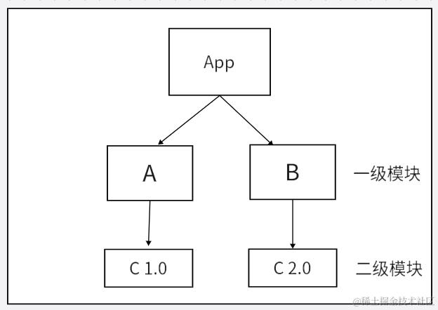 安装某个二级模块时,若发现第一层级有相同名称,相同版本的模块,便直接复用那个模块