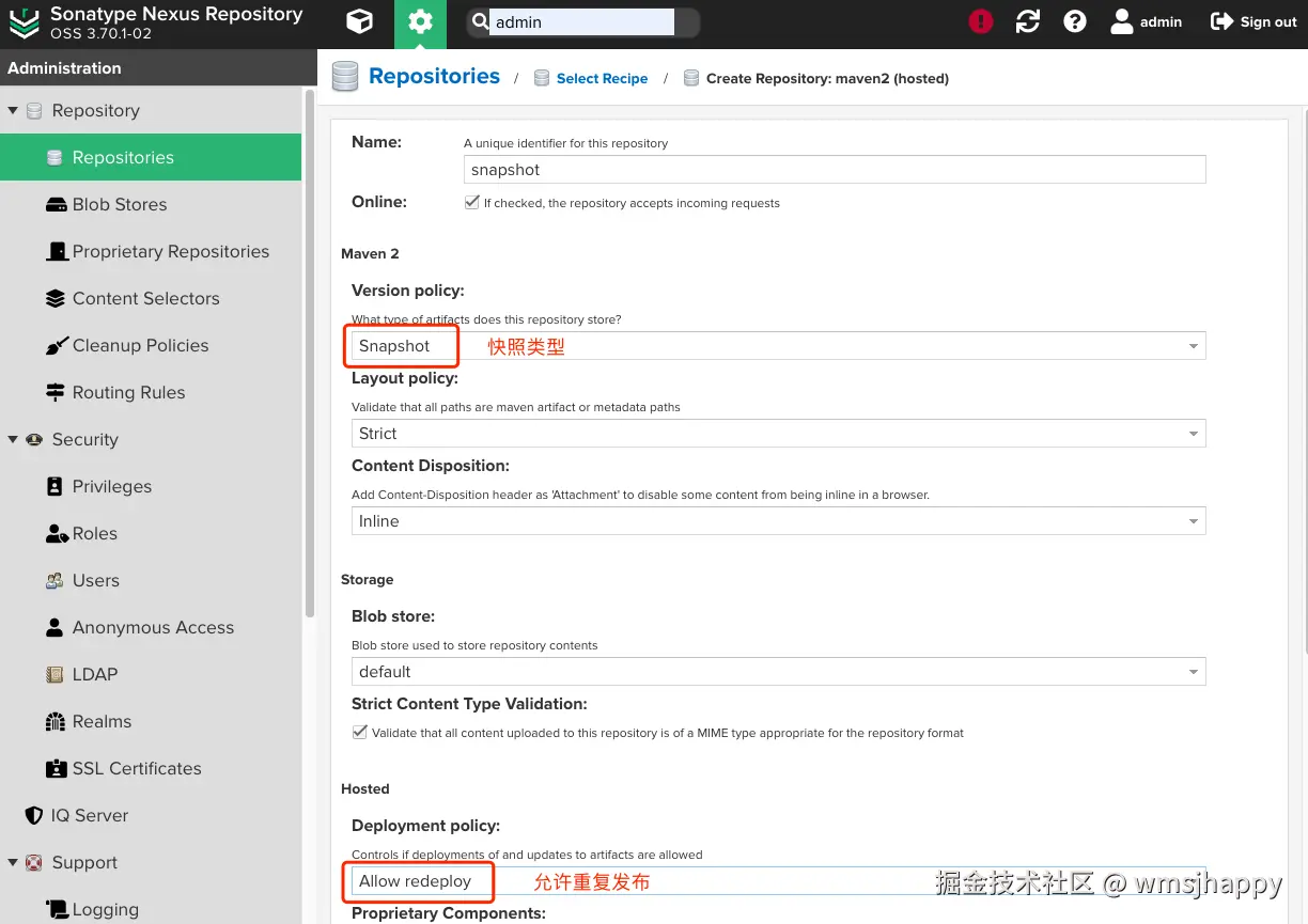 创建 snapshot快照仓库, 注意仓库类型和允许重复发布