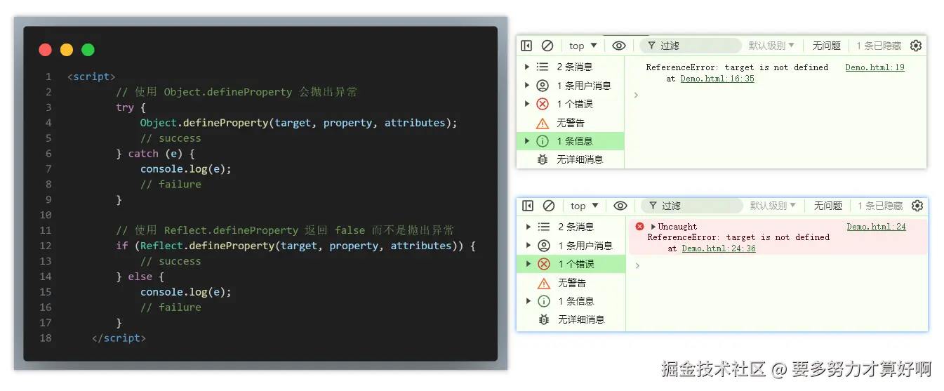 你要知道,如果只是抛出异常,我们在开发环境下,浏览器可能会打印很多console.log(),从而导致我们忽略了该错误,但是,如果是直接返回false或undefined,这就会引起我们的注意,确保我们不会错过任何错误提示。所以,这就是我选择Reflect的原因。