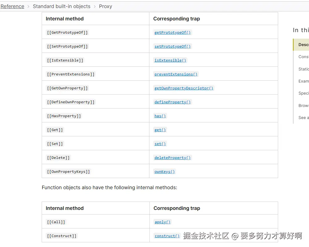 这里有13种方法,我就不一 一列举了, 大家可以直接参考 MDN-Reflect-静态方法,Reflect对象的方法与Proxy一一对应,只要是Proxy对象的方法,就能在Reflect对象上找到对应的方法。