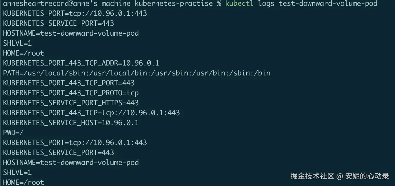 上面的Pod设置了metadata的annotations和labels,以便于验证挂载downward volume是否生效,具体的entrypoint的内容和上一个pod类似,也是开启一个循环不断打印容器内部环境变量的值