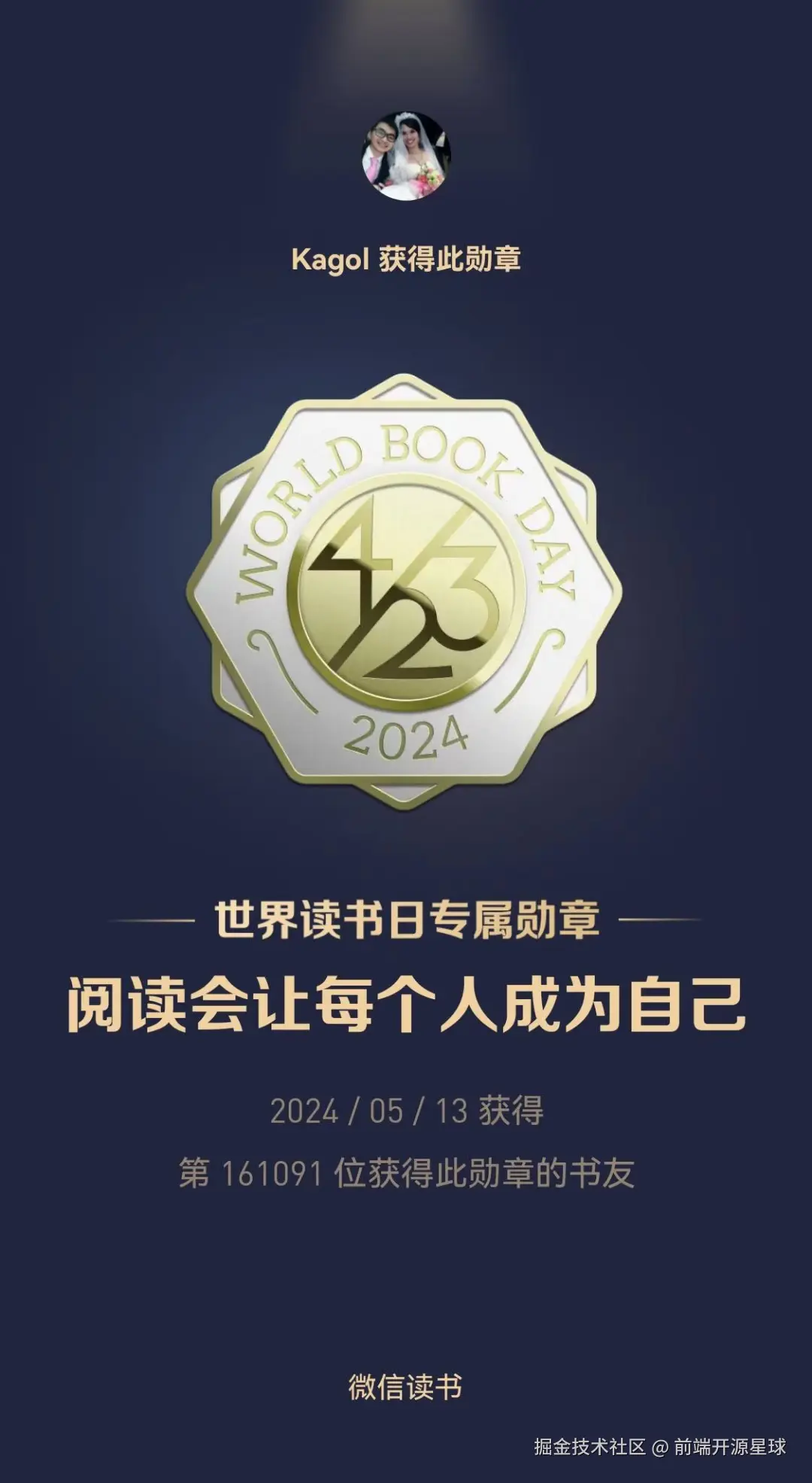 2024年4月23日是第29个世界读书日,从4.23-5.13,21天21小时,我顺利完成了微信读书的世界读书日挑战,获得423世界读书日特殊勋章🎉