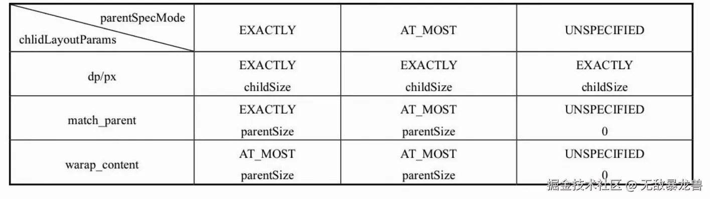 子元素的 MeasureSpec的创建与父容器的MeasureSpec和子元素本身的LayoutParams有关。
