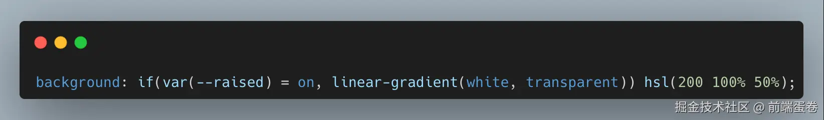 虽然现在还没有发布,没有环境可以让我们真实体验效果,但是我们可以从官方的css-conditional-values文档中管中窥豹, 了解一些常用的语法。