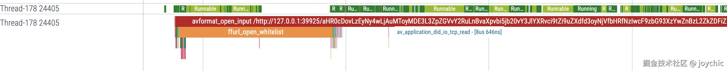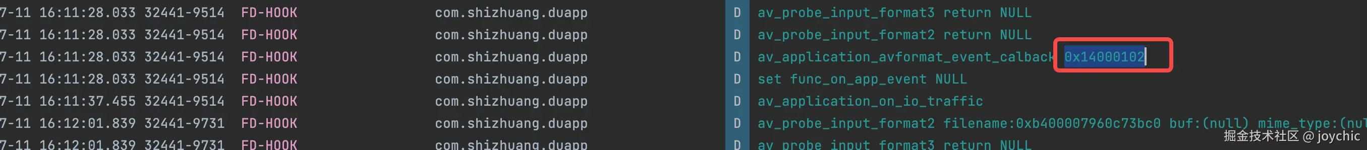 首先通过 readelf 命令导出 ffmpeg 这个so的符号表,然后通过inline hook 的能力对可疑函数逐个进行hook,同时在方法的入口和出口处通过ftrace的能力进行跟踪, 通过trace 观测到每次崩溃都是在 avformat_open_input 阶段,