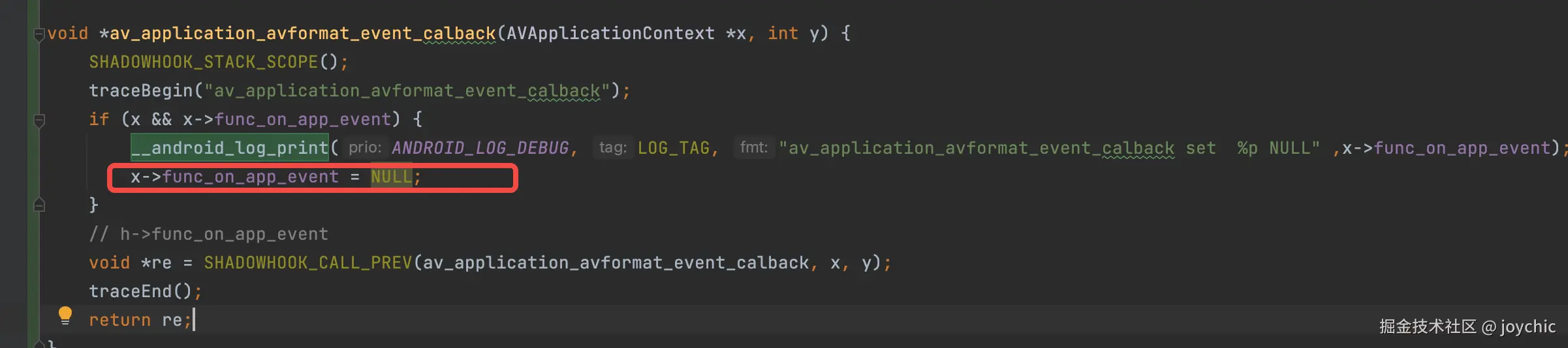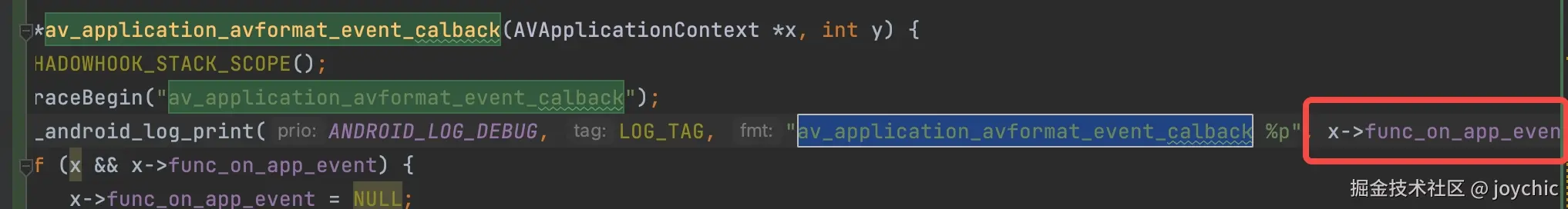 通过一次次追加信息,排查到 func_on_app_event 这个函数上, 试想着如果不让这个函数执行是否能表现正常呢?接着hook func_on_app_event ,将其置空后发现视频竟然能正常播放了,没崩!! 那么问题就确定了,func_on_app_event这个函数地址因为某种原因导致了地址错乱。至此我们知道了crash的原因,但是还不知道什么原因导致的 func_on_app_event 地址错乱。问题还需继续排查。