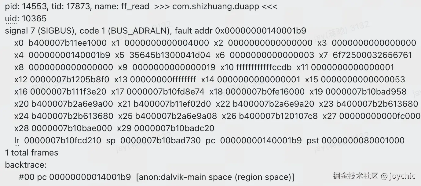 崩溃的包,打印出的函数地址空间对应的是 0x14000102,指向的是 dalvik 区域;