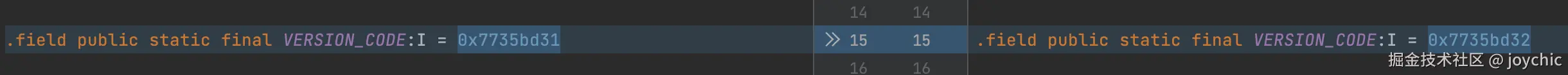 虽然现象难以理解,但对问题排查来说却很有帮助!同时在546的基线上,打了2个包,一个包versionCode是2000010545,不崩;另一个包versionCode是2000010546,崩了;解压对比smali以及so全部都完全一致,唯一的区别只有下面这一行。至此基本可以确定,2000010546这个 version code 会导致 func_on_app_event 函数指针异常。