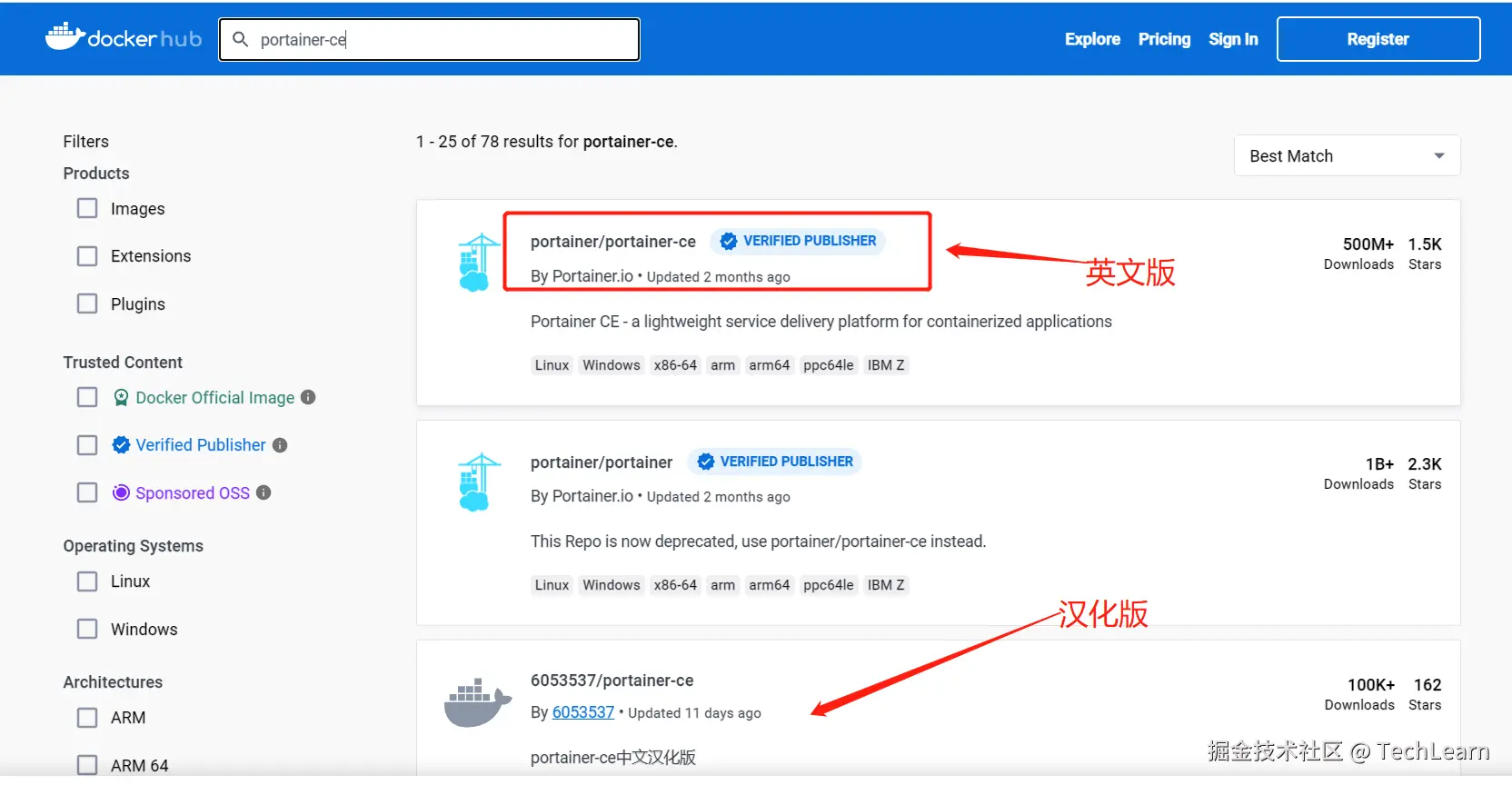 首先访问 hub.docker.com/ 搜索portainer-ce,找到适合自己的版本。