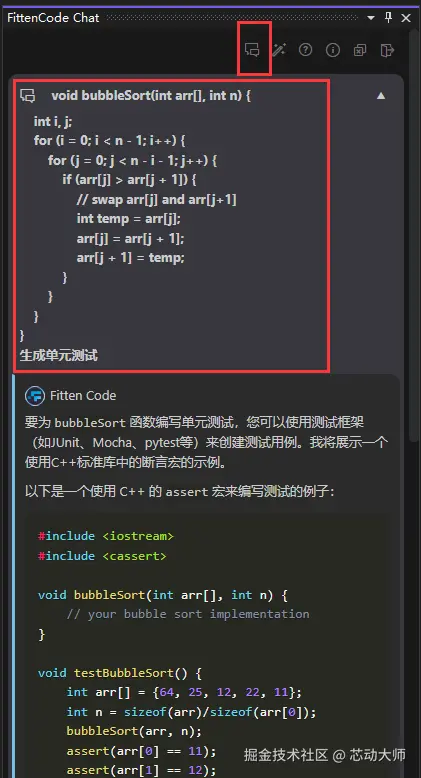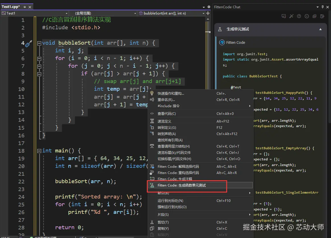 Fitten Code 拥有自动生成单元测试的功能,可以根据代码自动产生相应的测试用例,提高代码质量和可靠性。通过选中代码段后右键选择 "Fitten Code – 生成函数单元测试" 来实现,如下图所示:
