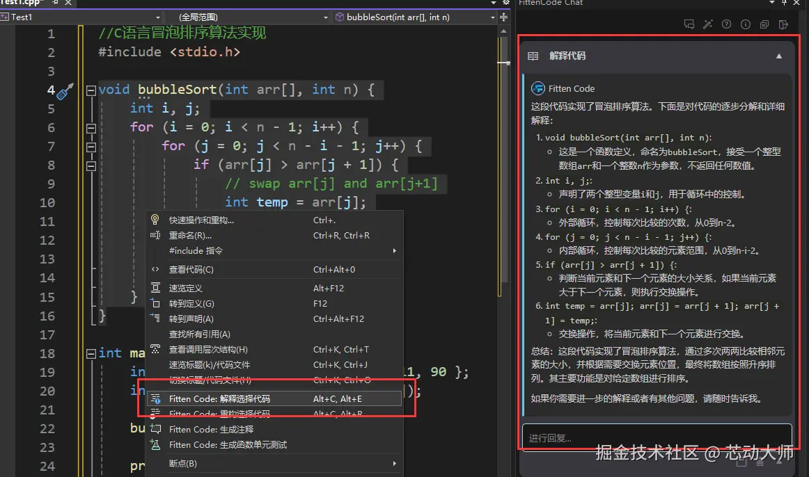 Fitten Code 可以对一段代码进行解释,可以通过选中代码段然后右键选择 "Fitten Code – 解释代码" 进行解释,如下图所示: