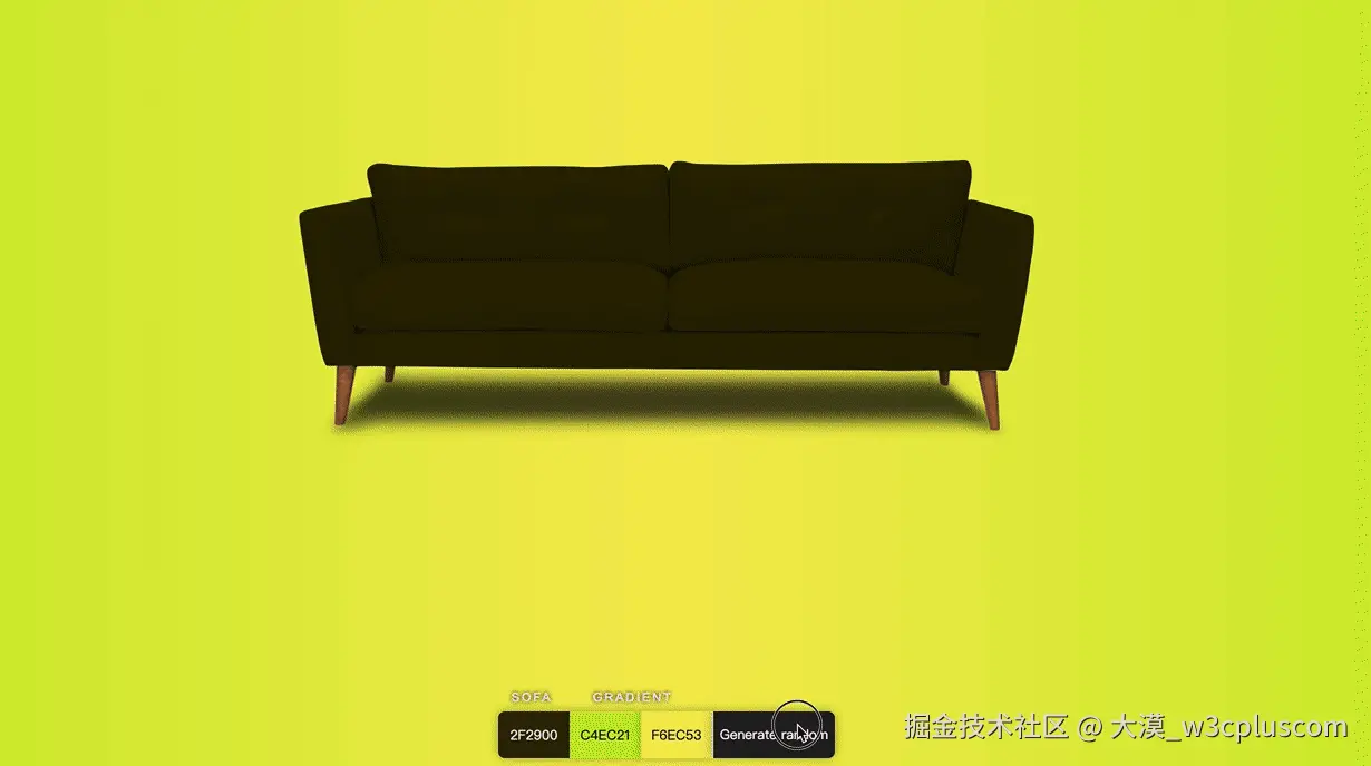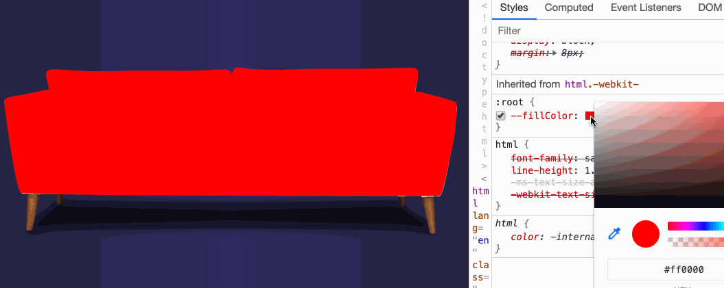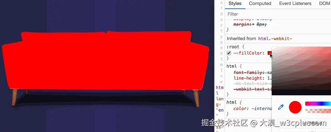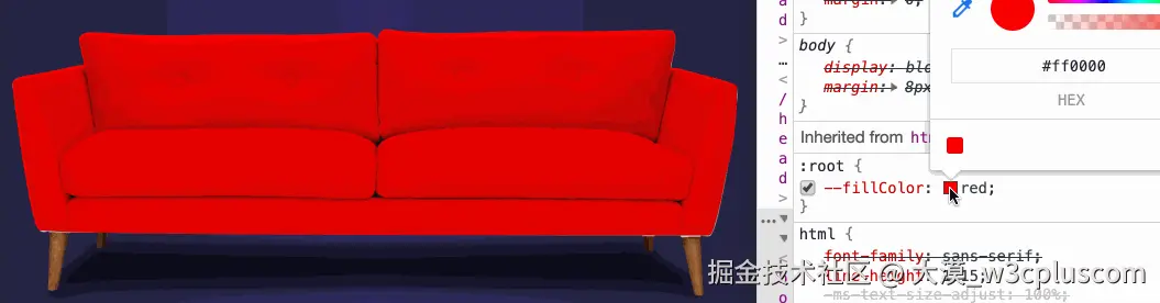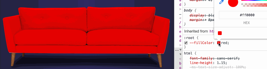 这里使用了mix-blend-mode属性,设置其属性值为multiply。接着你再修改--fillColor的值时,沙发的颜色也会跟着修改: