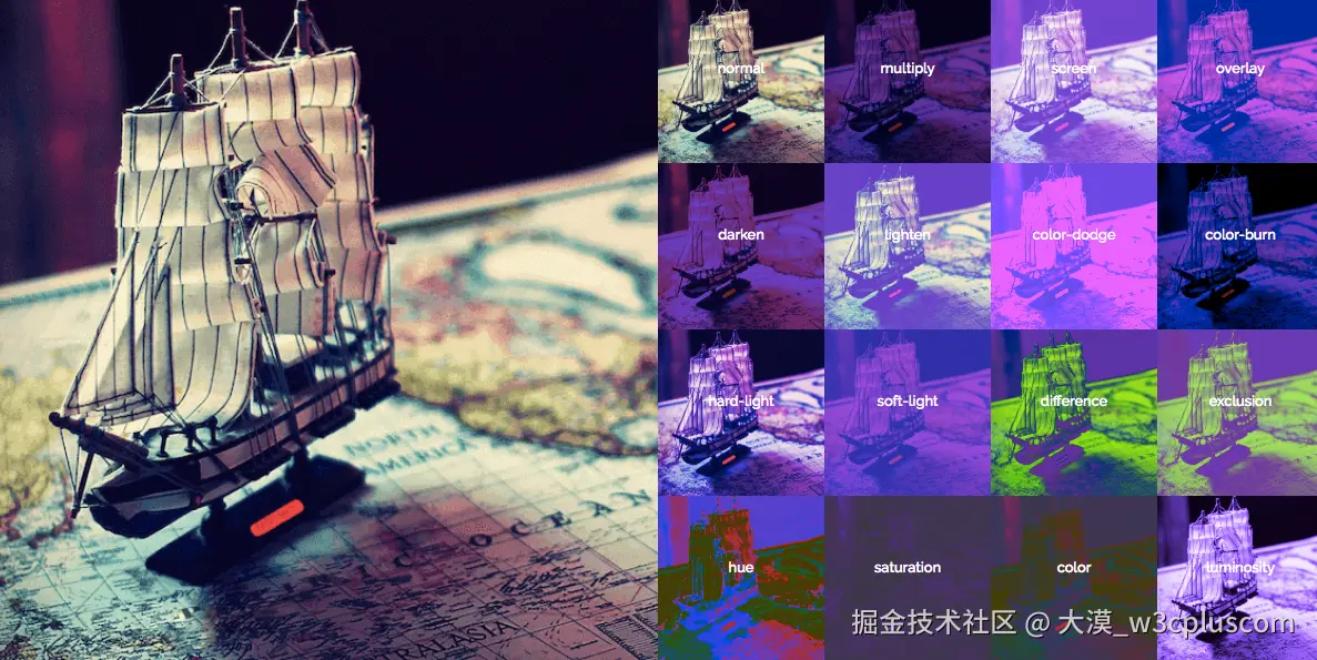 如果希望顺利的实现上面示例的效果,那么需要具备一点点基础知识。比如CSS的混合模、SVG等。使用CSS的混合模式不同的属性值,我们可以轻易的改变一张图片的效果: