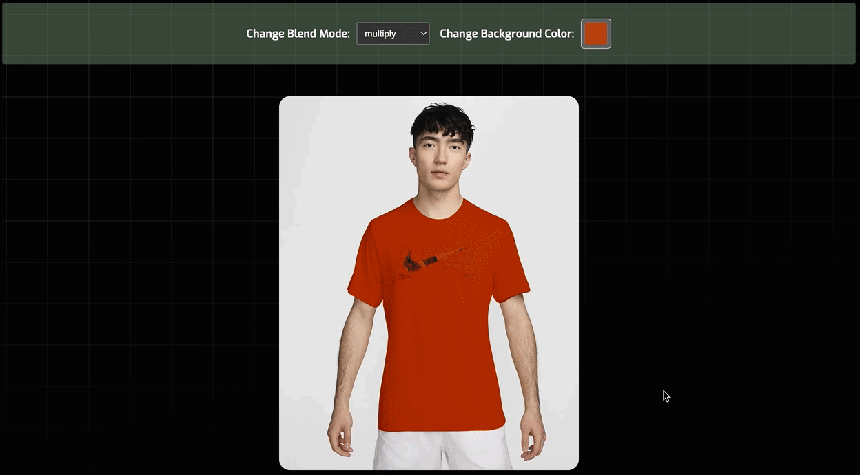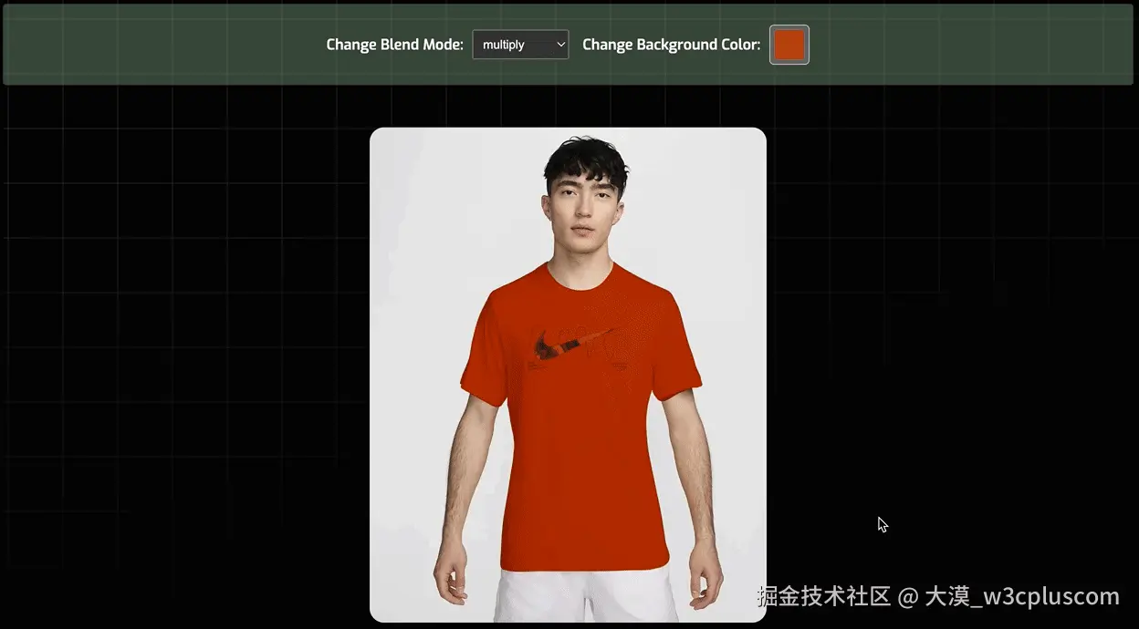 注意,这里我们演示的是 mix-blend-mode 属性值为 multiply 的效果,但这并不意味着,只能将 mix-blend-mode 属性设置为 multiply ,你也可以设置为其他值,这些值会根据你输入的填充颜色,动态改变产品图颜色。请尝试着调整下面示例中的混合模式,查看产品图颜色的变化: