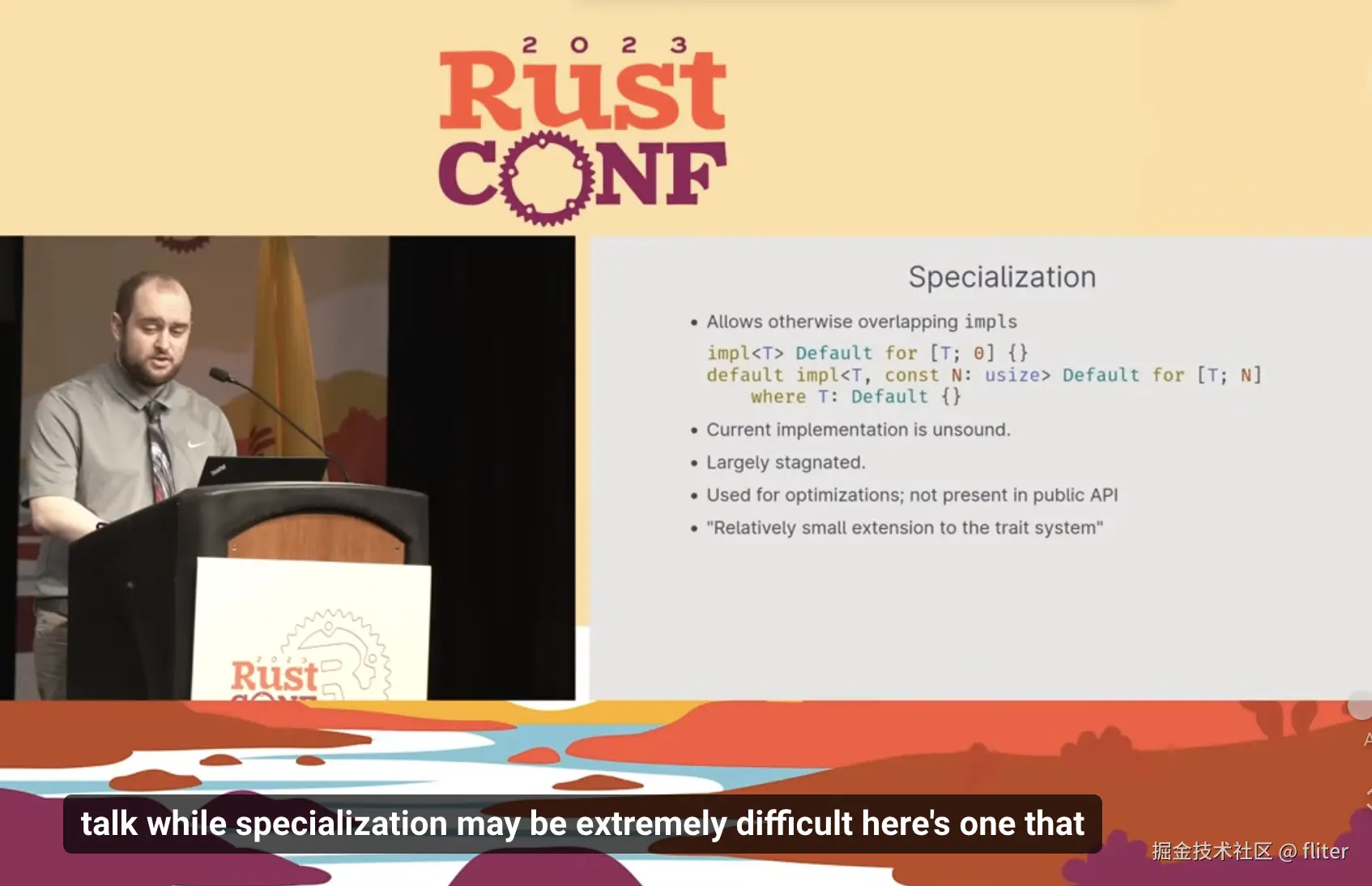 提议特化的RFC于2015年7月发布,就在Rust 1.0发布两个月后。在RFC中,特化被描述为"trait系统的一个相对较小的扩展"。我想我们都同意这有点乐观了。特化可能是本次演讲中提到的最困难的项目。