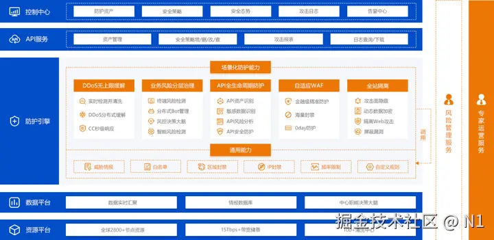 聚合DDoS云清洗、Web攻击防护、业务安全、API安全、全站隔离5大模块,实现覆盖L3-L7层的全站防护。
