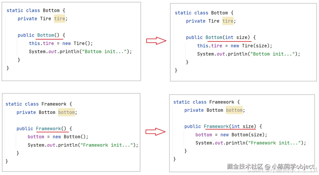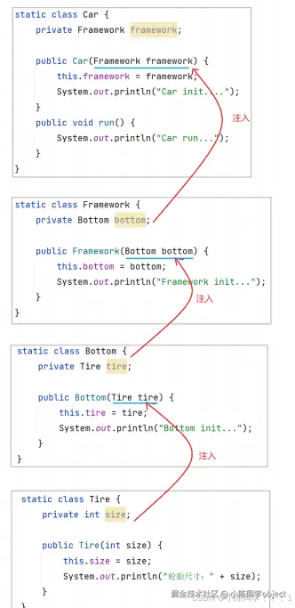 此时,我们只需要将原来由⾃⼰创建的下级类,改为传递的⽅式(也就是注⼊的⽅式),因为我们不 需要在当前类中创建下级类了,所以下级类即使发⽣变化(创建或减少参数),当前类本⾝也⽆需修 改任何代码,这样就完成了程序的解耦.