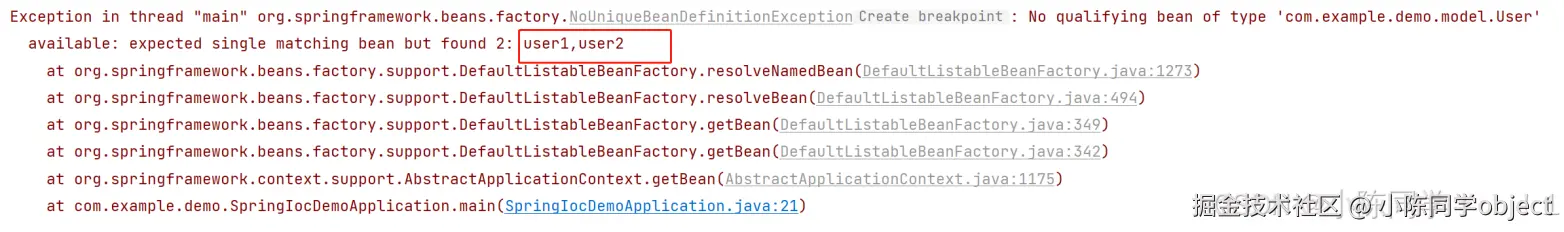 报错的原因是,⾮唯⼀的 Bean 对象(当容器中存在多个同一类型的 Bean 时,Spring 无法确定应该注入哪一个 Bean 到目标对象中)