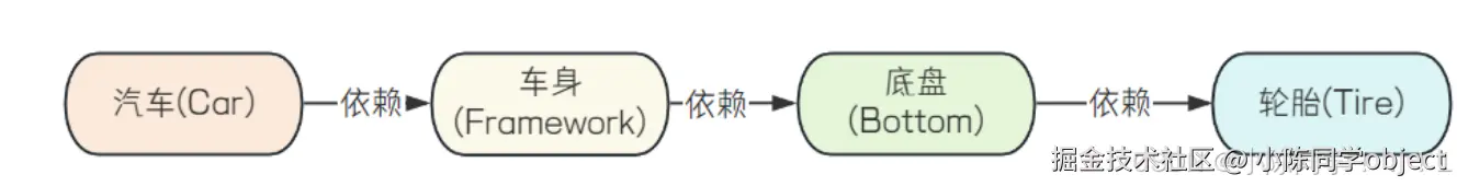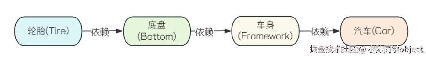 先设计轮⼦(Tire),然后根据轮⼦的⼤⼩设计底盘(Bottom),接着根据底盘设计⻋⾝(Framework),最 后根据⻋⾝设计好整个汽⻋(Car)。这⾥就出现了⼀个"依赖"关系:汽⻋依赖⻋⾝,⻋⾝依赖底盘,底 盘依赖轮⼦.