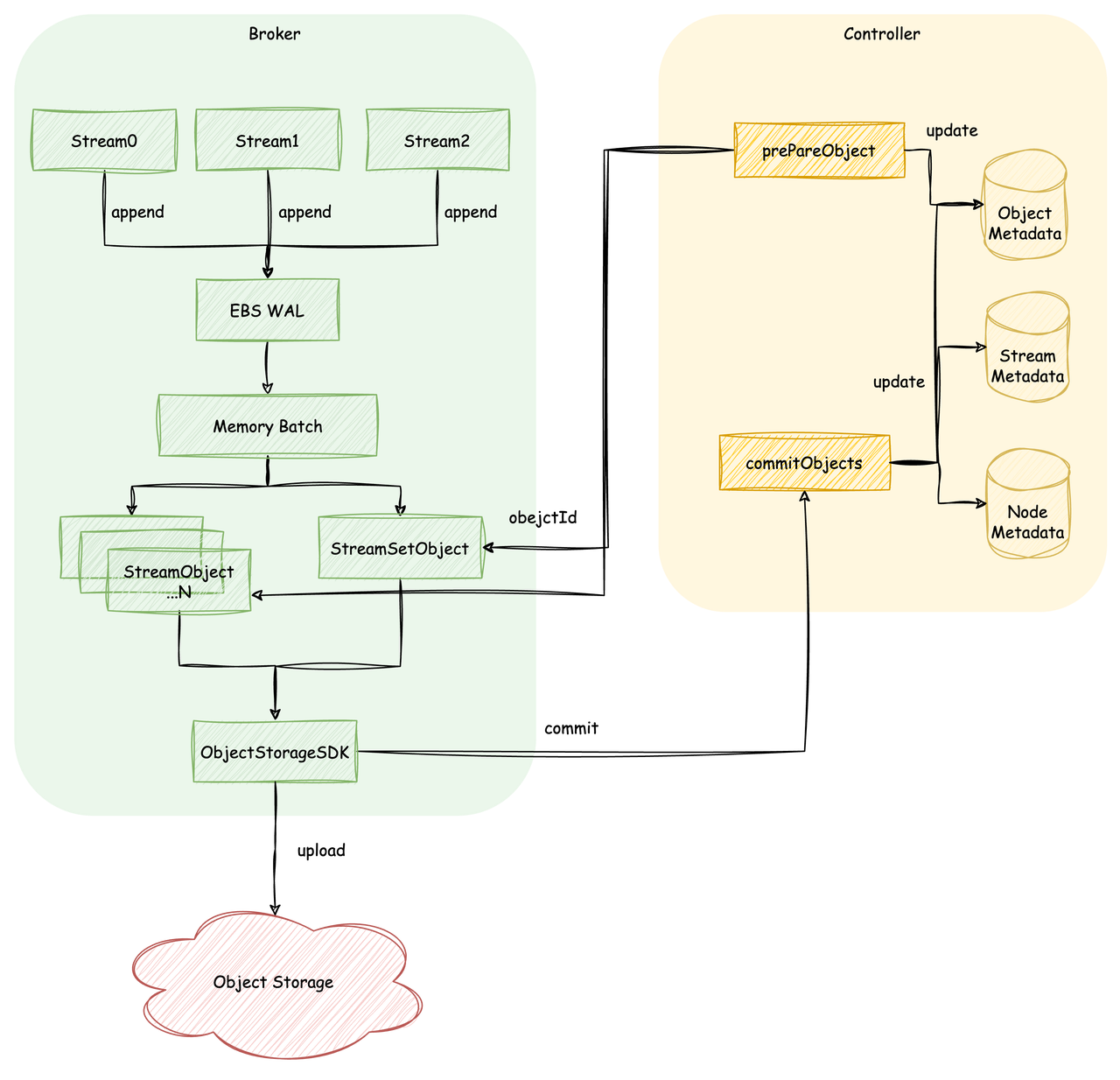 所有针对分区的写入通过上述 MetaStream 中解析出的映射关系,最终都会转变为对 Stream 的写入,而所有 Stream 写入的数据都会首先写入 EBS WAL,持久化成功后直接向上层返回结果;同时写入的数据会继续在内存中进行混合攒批,直到攒批大小超过阈值时触发上传。上传触发后,节点会遍历此次攒批的数据中的各个 Stream,将连续数据段超过一定阈值大小的上传为 StreamObject,剩余数据上传为 StreamSetObject。每个 Object 上传时,节点会先向 Controller 申请全局唯一的 Object Id,此时 Controller 的 Object 元数据中会记录下该 Object 的状态和过期时间,节点通过 Object Id 生成对象存储的写入路径并上传数据。当本次上传任务产生的所有 Object 全部写入完成后,节点会向 Controller 发起 Commit 请求,Controller 将产生一系列 KRaft Record 更新元数据: