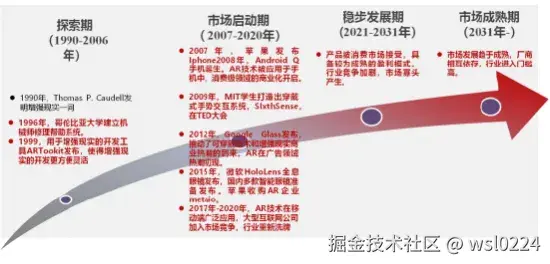 从 1990 年增强现实概念的提出,到 1999 年第一个增强现实 SDK 诞生,2000 年第一款 AR 游戏 AR-Quake 的发布,增强现实在探索期逐步发展,到了2012 年,谷歌推出AR 眼镜把增强现实带入大众视野, 让消费者开始接收增强现实概念,2015 年现象级 AR 手游《Pokémon GO》的出现将增强现实推向第一个高潮,《Pokémon GO》只用了 63 天,通过 iOS 和 Google Play 应用商店在全球就赚了 5 亿美元,成为史上赚钱速度最快的手游。同年,微软发布了 AR 头戴显示器Hololens,被誉为目前已发布的体验最好的 AR 设备。2016 年 AR 初 创公司Magic Leap 获得巨额融资,资本市场的看好给 AR 带来了新的契机。2017 年科技巨头苹果打造 AR 开发平台,苹果在 iOS 11 中带来了全新的增强现实组件ARKit,让 AR 应用的开发门槛进一步降低。随后各种中小 AR 初创企业如雨后春笋的不断涌现,按照预期 AR 将从 2031 年进入市场成熟期。