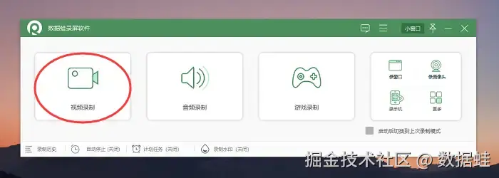 步骤1:打开数据 蛙录屏软件,选择录制模式,如果你想要对电脑屏幕进行录制,推荐使用 “视频录制” 模式。