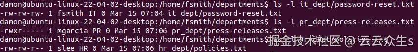 考虑以下示例,您需要将 fsmith 帐户设置为 password-reset.txt 文本文件的所有者,您是在本教程开始时创建的: