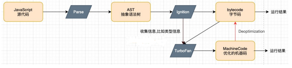 - 但是,机器码实际上也会被还原为ByteCode,这是因为如果后续执行函数的过程中,类型发生了变化(比如sum函数原来执行的是 number类型,后来执行变成了string类型),之前优化的机器码并不能正确的处理运算,就会逆向的转换成字节码;