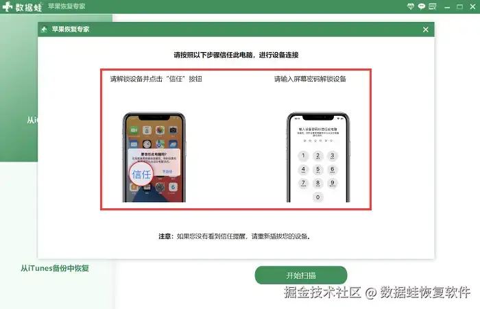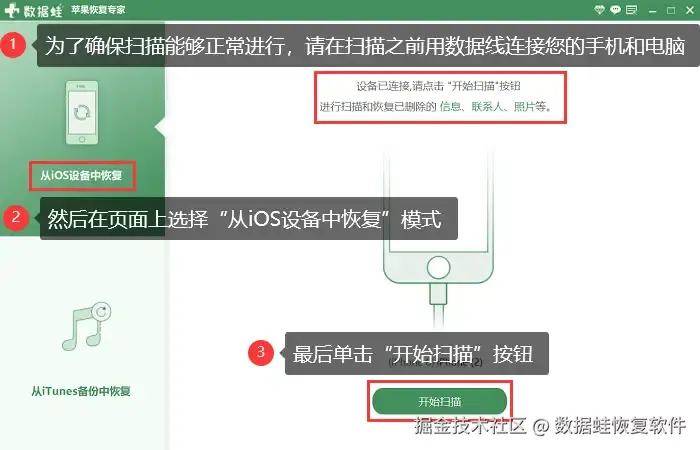 步骤3:在软件界面上,确保设备连接成功。在 【从iOS设备中恢复】 界面下方单击 【开始扫描】 按钮。