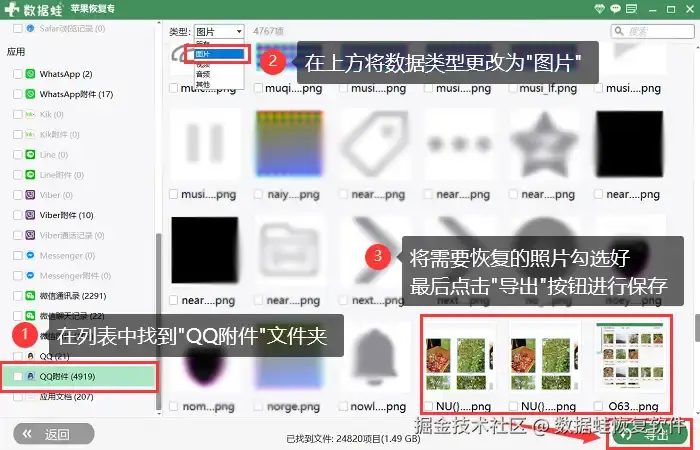 步骤4:在扫描结果中,点击 【QQ附件】 选项,然后找到并选择要恢复的QQ过期照片。选中要恢复的照片后,点击 【导出】 按钮。再选择一个合适的存储路径,将照片保存到电脑上。