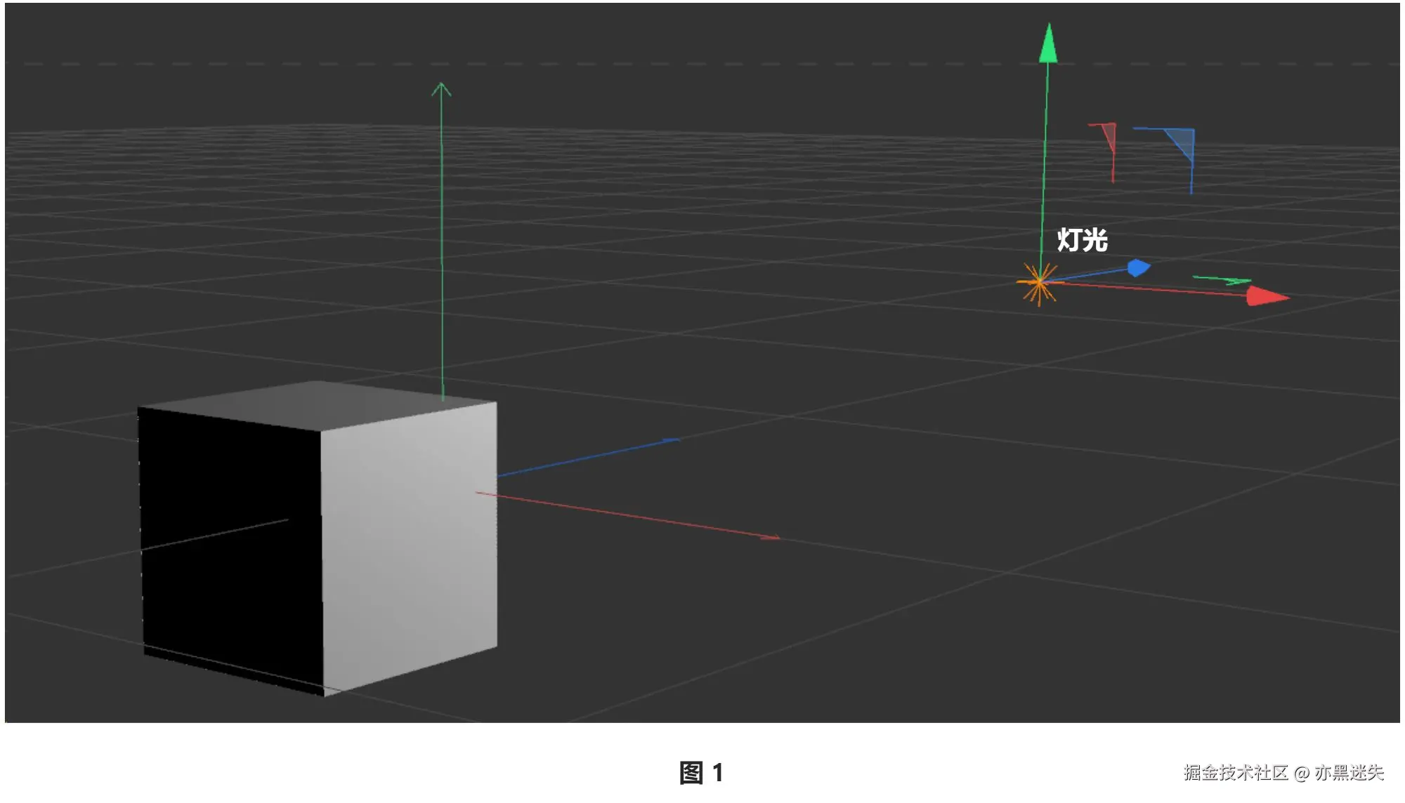 由于各个面都是同样的灰色,所以想要看出它是个立方体,需要一定的想象力的加持。在 c4d 等构建三维物体的软件里,我们是可以添加灯光对象的,从而让物体表面呈现出明暗对比,让人一眼看出物体的形状: