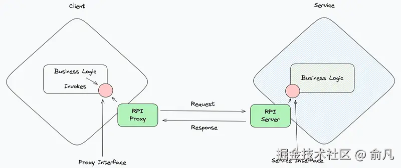 下图显示了 RPI 的工作原理。客户端中的业务逻辑会调用 PRI 代理适配器类实现的代理接口,RPI 代理向服务发出请求。