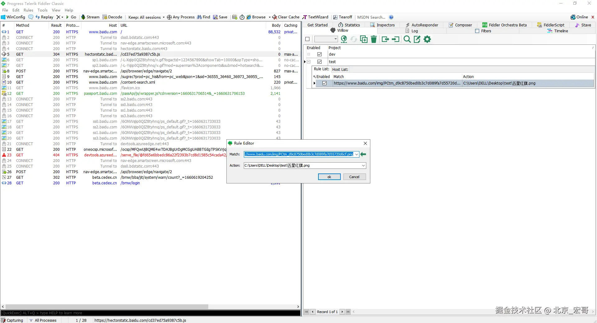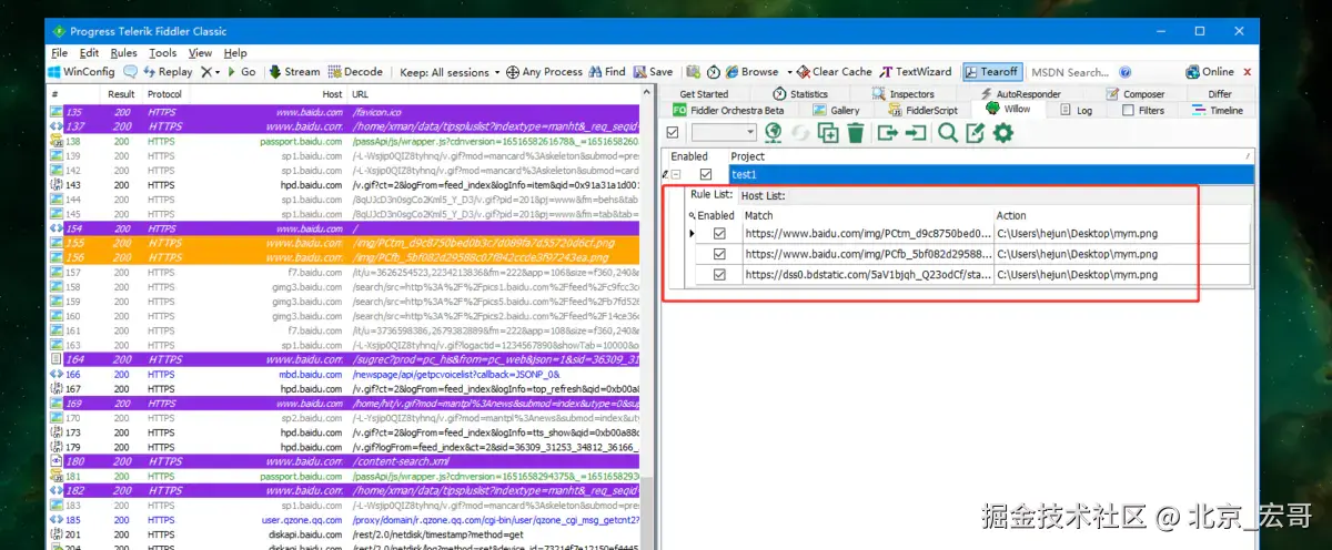 我们还可以利用Willow给项目添加自动响应规则, 虽然Fiddler中的AutoResponder也有这个功能,但是Willow更加强大。例如:当请求百度页面的时候,将百度logo图片替换为本地图片。具体操作步骤如下: