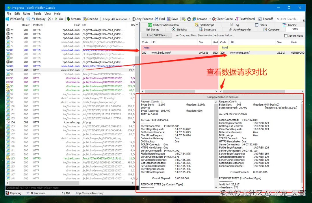 3.直接把抓到的数据会话拉入到里面就可以进行对比查看了, 这对前端检查页面优化很有帮助。如下图所示: