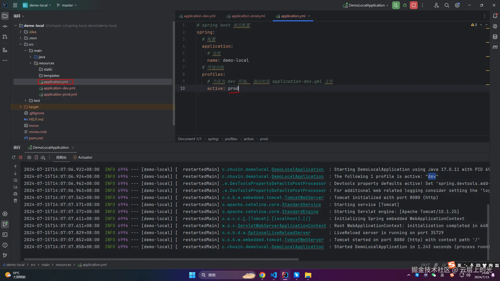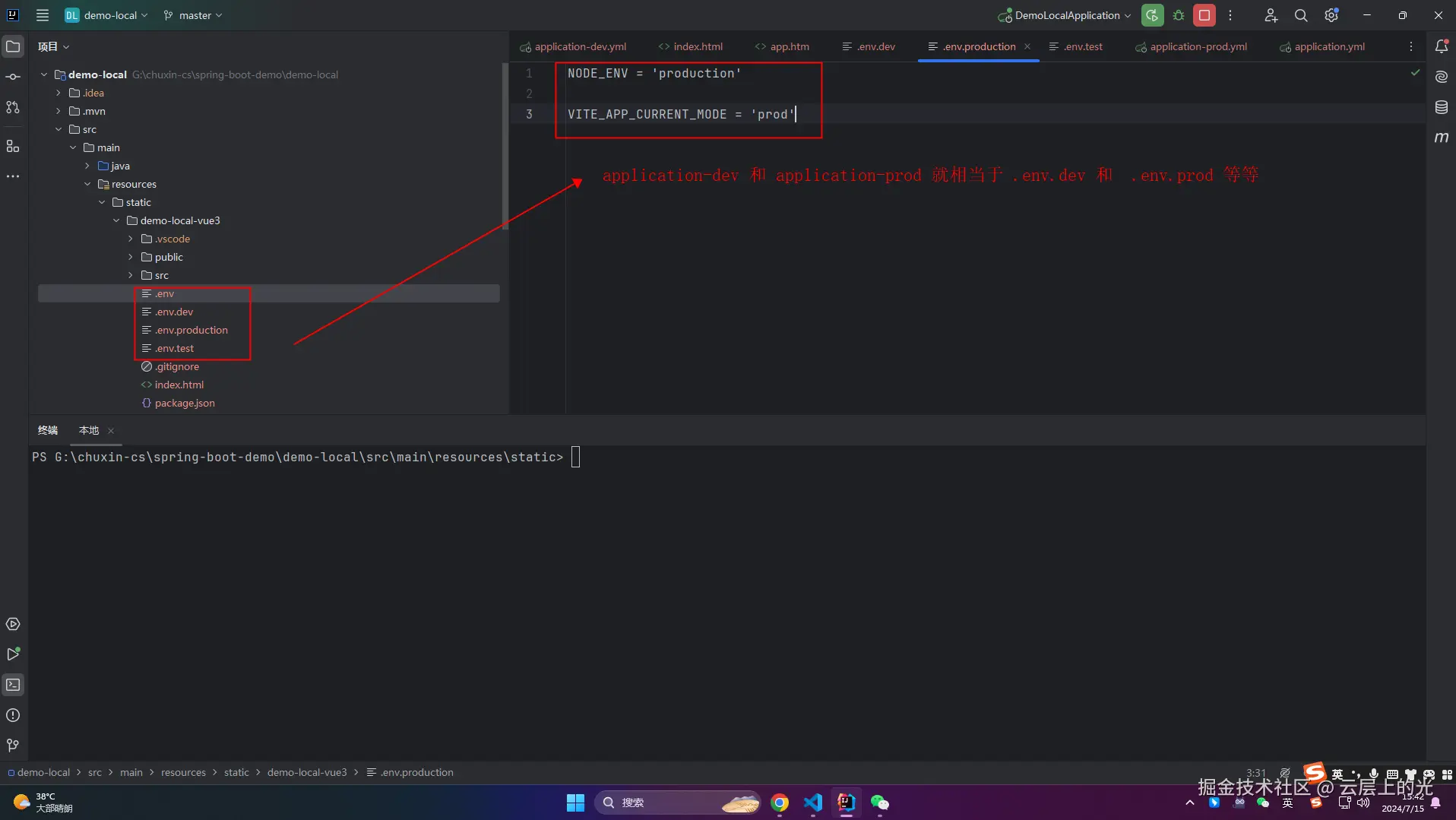 application-dev 和 application-prod 就相当于 .env.dev 和 .env.prod 等等(这里只列举了生产和开发)