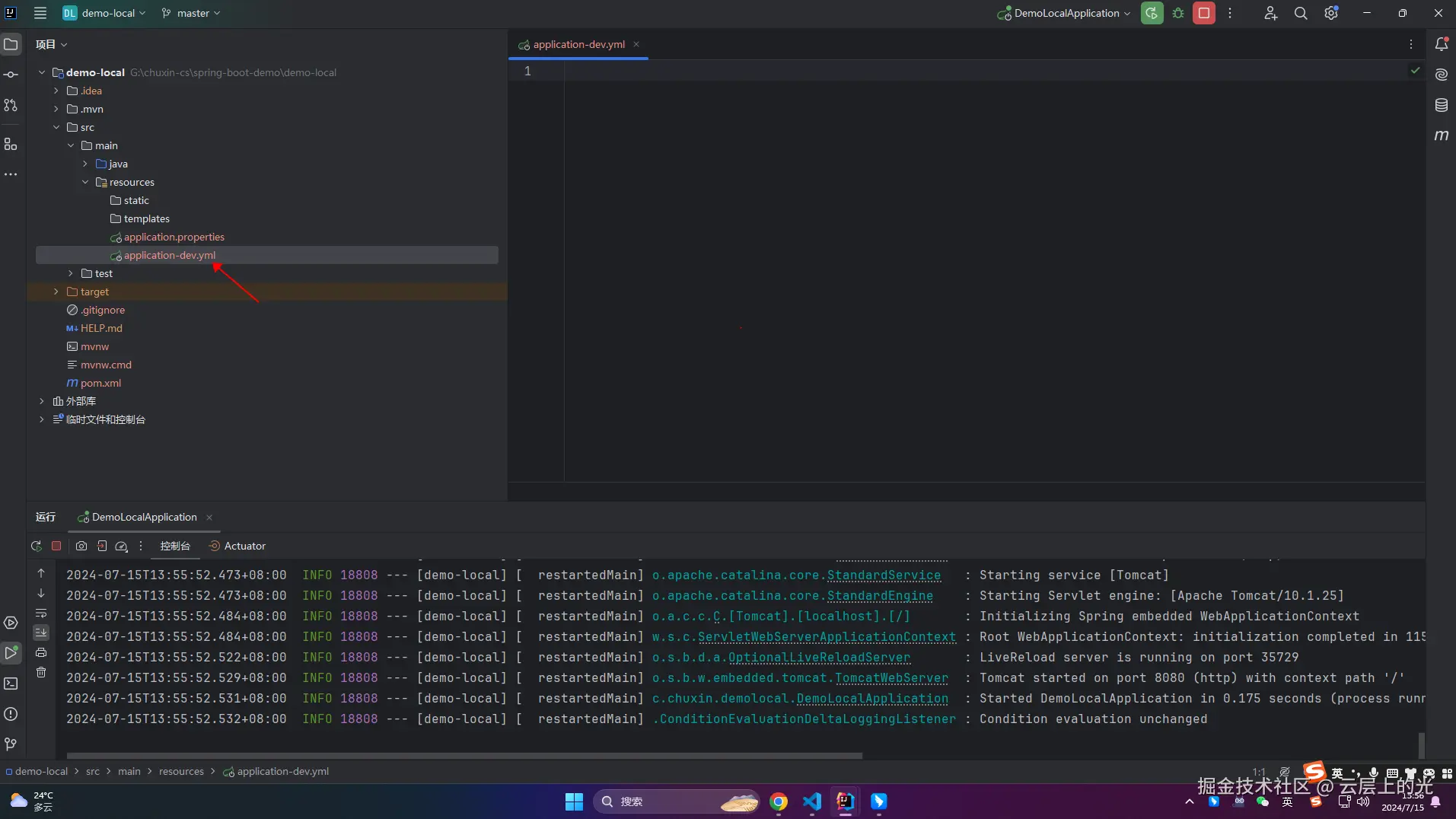 2、resources 软件包下新建 application-dev.yml 文件