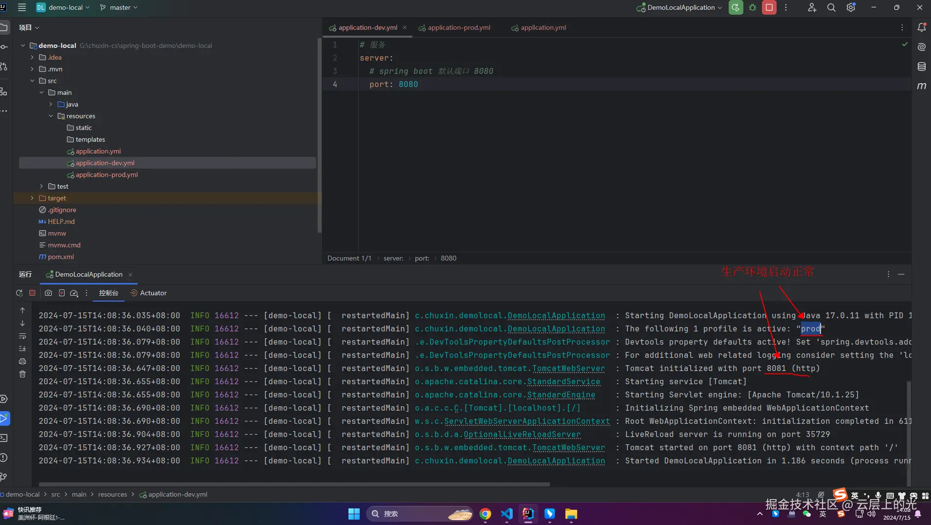 # spring boot 默认端口 8080 当前环境是 prod 端口监听8081