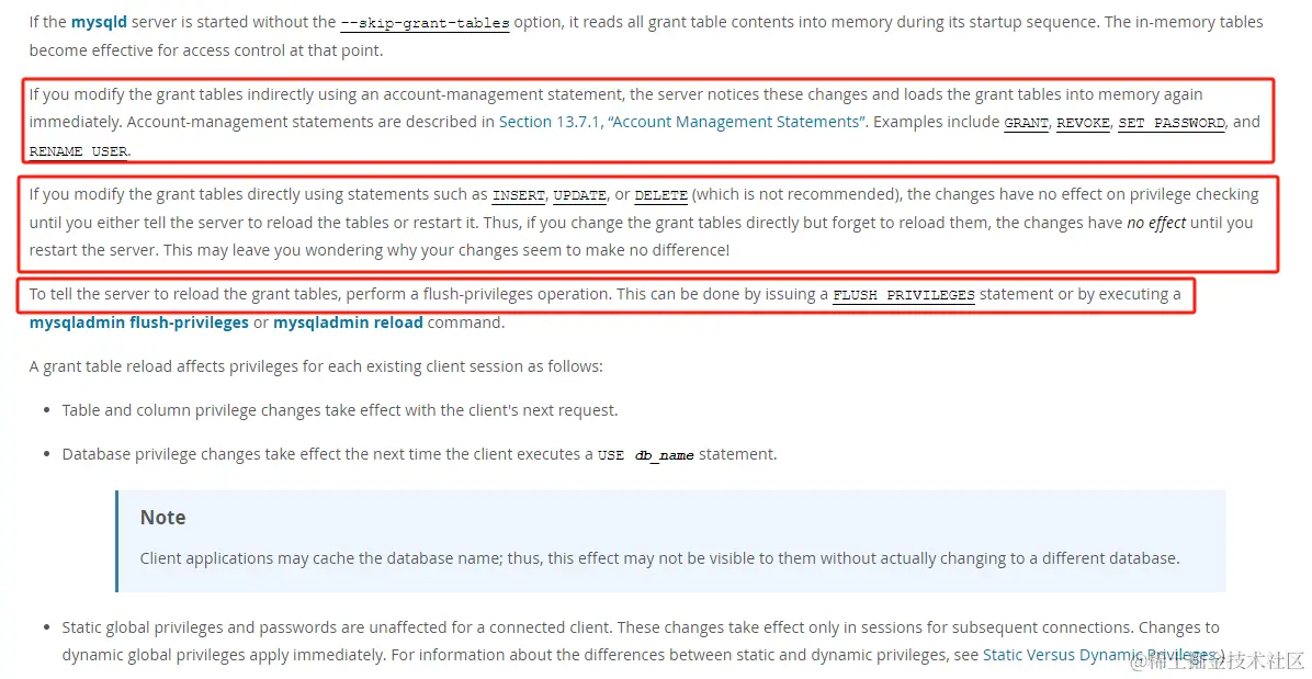 mysql.user表,可能会引发其他的问题,若使用了 DML 语句进行变更,需要手工执行flush privileges。
