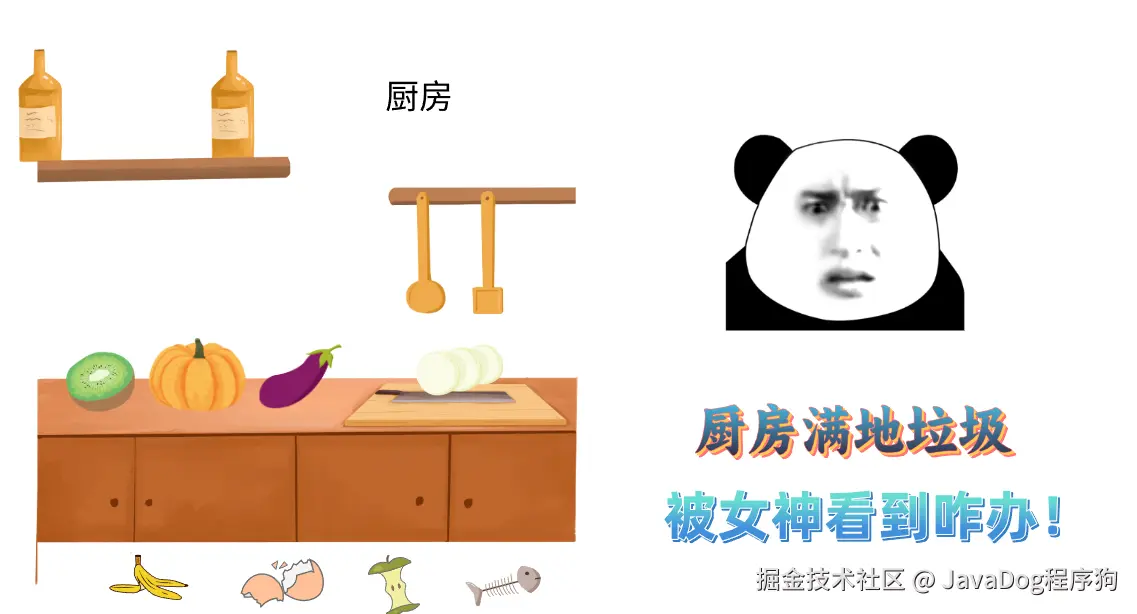 本狗在厨房里忙着做黑暗料理,突然电话响了,是女神说他马上就到。这时候,我不能让女神看到厨房乱七八糟,也不能让半成品的食物和满地垃圾放着不管,那咋办呢?