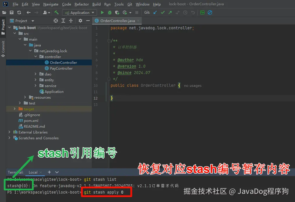 3.使用git stash apply stash引用号,进行恢复暂存数据