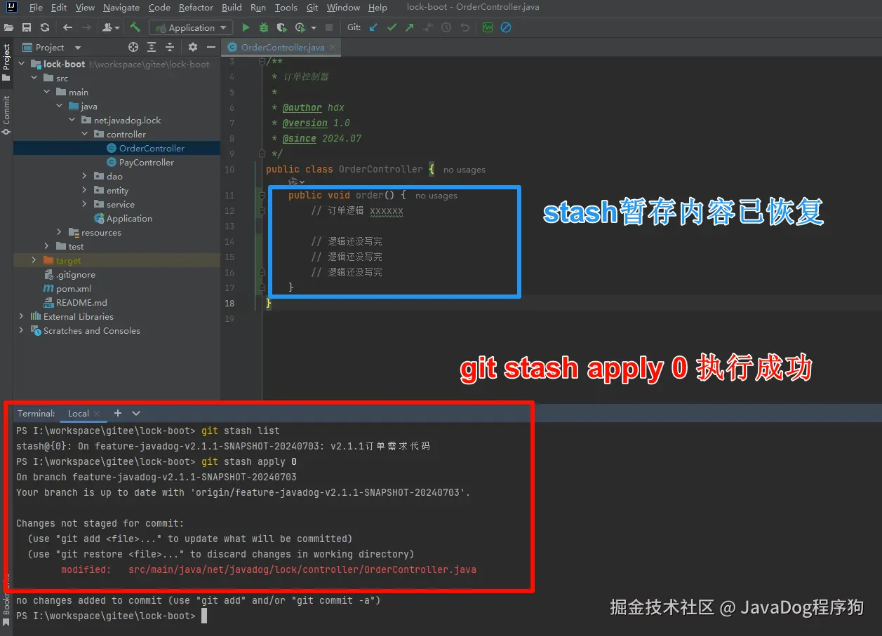 4.使用 git stash apply 来应用最新的stash
