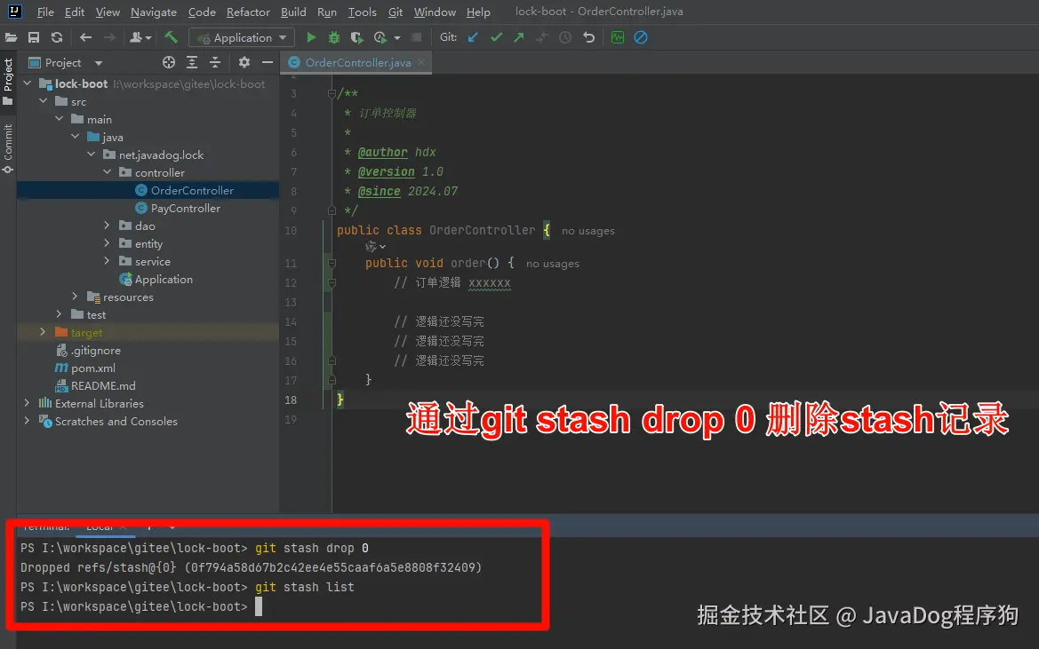 4.使用git stash drop stash引用号,进行暂存数据清理