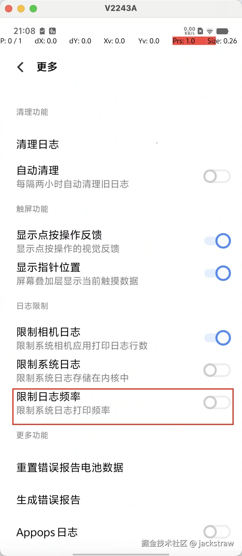 IQOO 11 logcat日志不显示的问题 jackstraw 2024-07-15 968 阅读1分钟 问题: 在IQOO 11的手机上,logcat日志时显示时不显示的问题,代码是正常执行到的,但90%的概率logcat上会不打印这行日志。 原因: 手机系统显示了日志频率,因为app比较庞大,日志里比较大,命中了系统限制。vivo其它手机可能也有类似的问题。 解决: 手机拨号界面输入*#*#112#*#*,「右上角... -> 更多 -> 限制日志频率」,关闭开关