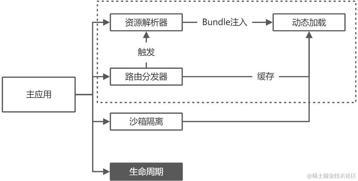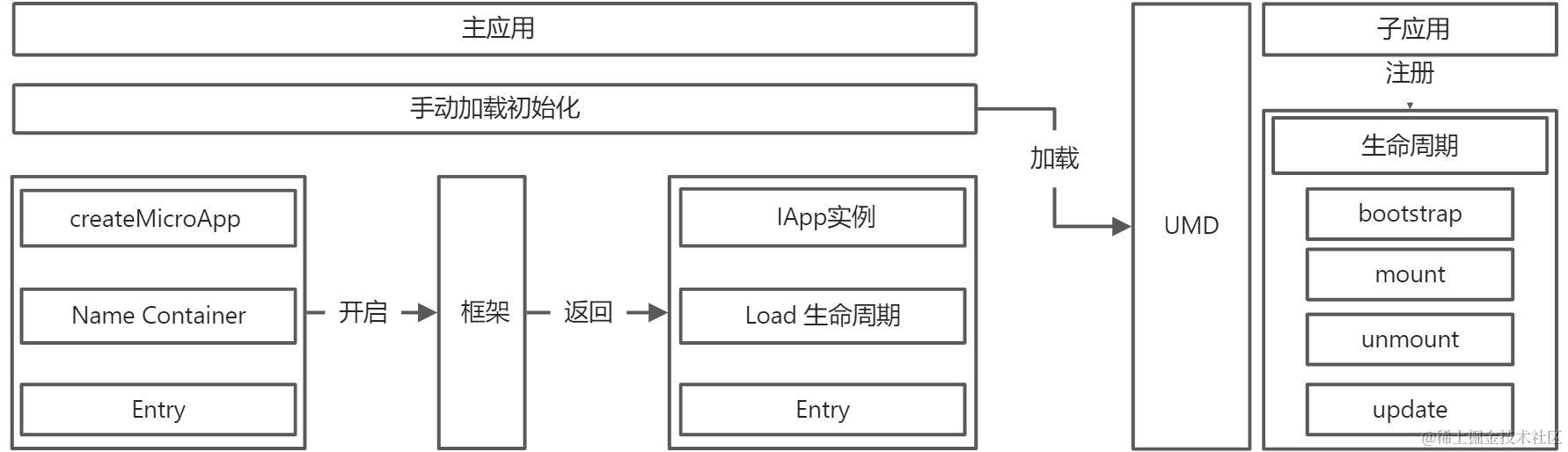 主应用手动加载方案初始化,注册配置文件。IApp 实例 load 函数会找到对应子应用的bundle,把子应用暴露出来的mount钩子做一个加载。