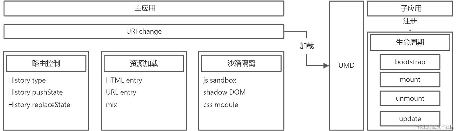 监听路由变化,url entry,本质就是静态资源,拿到对应的js/css,识别加载bundle,触发mount钩子,渲染对应子应用。