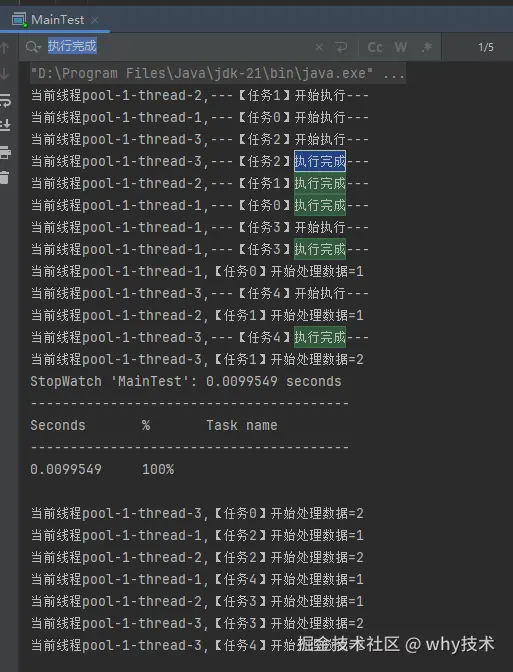 这个代码运行起来是没有任何问题的,我们在日志中搜索“执行完成”,也能搜到 5 个,这个结果也能证明程序是正常结束的: