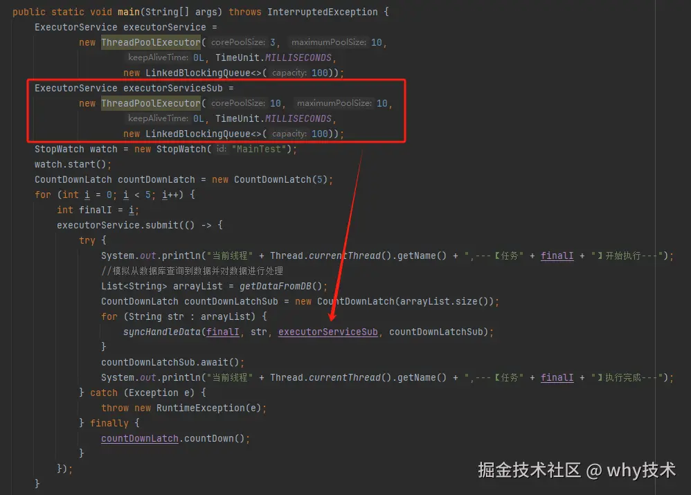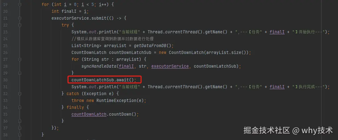 是父任务在等待子任务执行结束,运行 finally 代码,把 countDownLatchSub 的计数 countDown 到 0,才会继续执行: