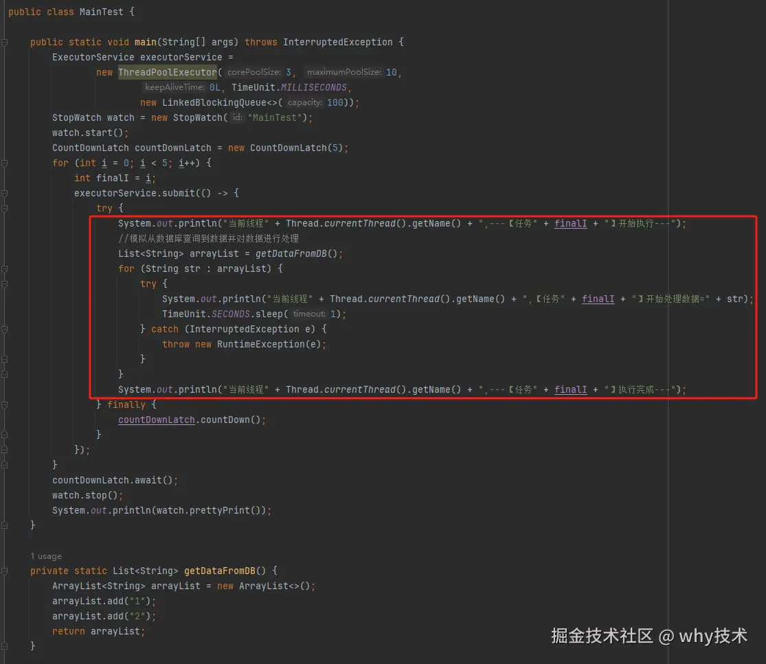 其他的 StopWatch 是为了统计运行时间用的。 至于 CountDownLatch,你可以理解为在业务流程中,需要这五个任务都执行完成之后才能往下走,所以我搞了一个 CountDownLatch。