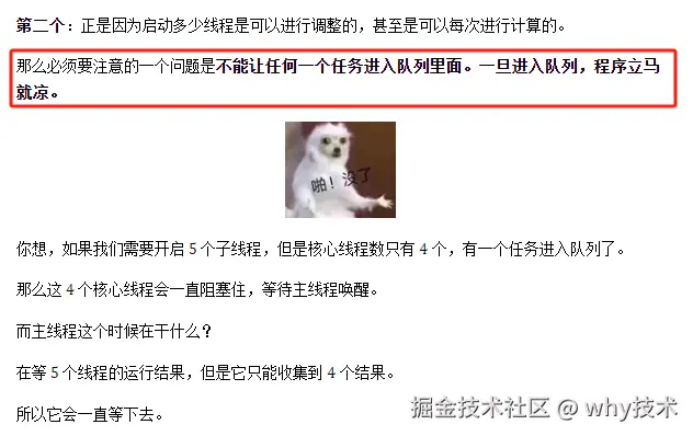如果线程池的任务之间存在父子关系,那么请不要使用同一个线程池。如果使用了同一个线程池,可能会因为子任务进了队列,导致父任务一直等待,出现假死现象。