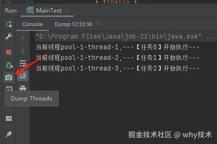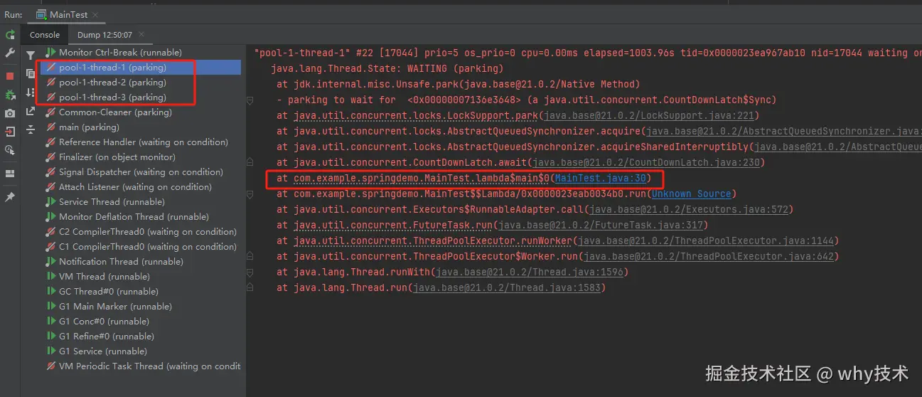 通过 Dump 文件,可以发现线程池的线程都在 MainTest 的第 30 行上 parking ,处于等待状态: